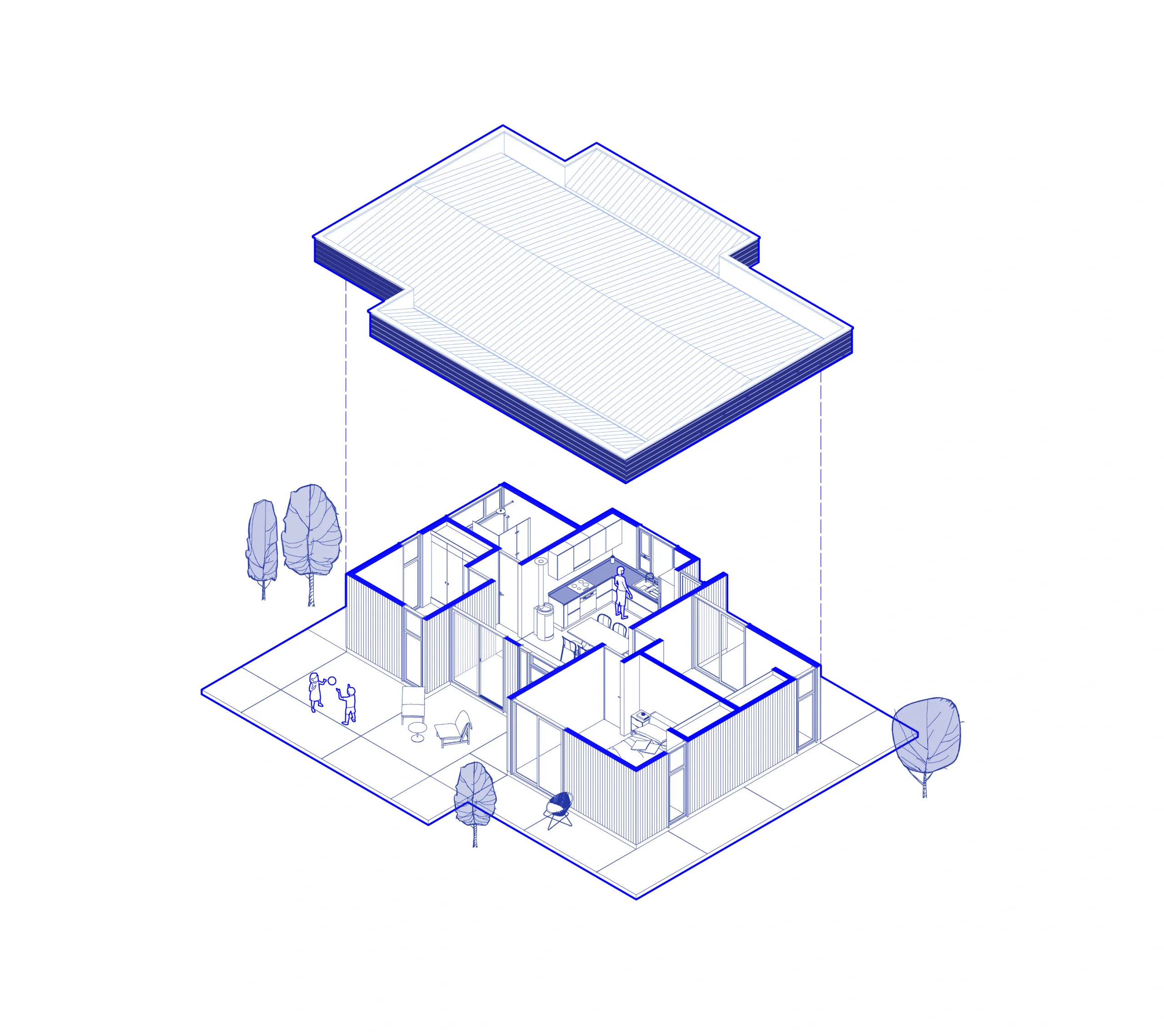 El alero es una segunda vivienda de un piso, emplazada en los verdes paisajes entre cerros y morros cercanos a la Florida. Fue diseñada para una joven pareja y padres de un pequeño, con el anhelo de tener un lugar donde disfrutar de la tranquilidad del entorno, como un descanso de la ciudad por breves estancias de tiempo. La propuesta es una búsqueda en proyectar los límites de la vivienda hacia el exterior e introducir el paisaje a la vida cotidiana y al interior. El proyecto trabaja el elemento de la techumbre con la intención de configurar un alero, que protege de los fuertes soles de verano, y da refugio de las intensas lluvias del invierno. Este mismo alero, ya en dimensiones de mayor envergadura, confecciona el acceso y terraza abierta hacia las hermosas vistas, fomentando una vida más relacionada con habitar el exterior, habitar el paisaje y el roce con la naturaleza.