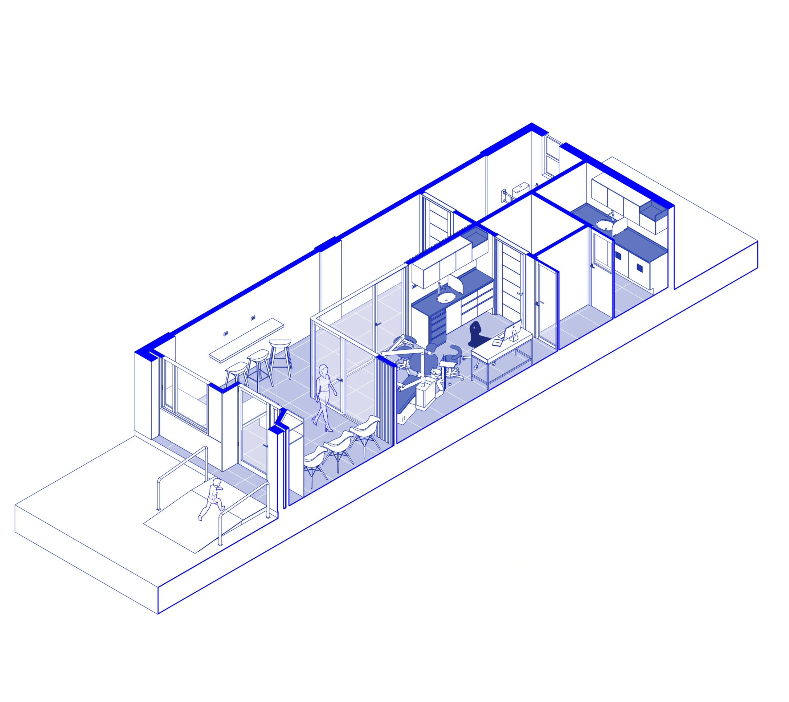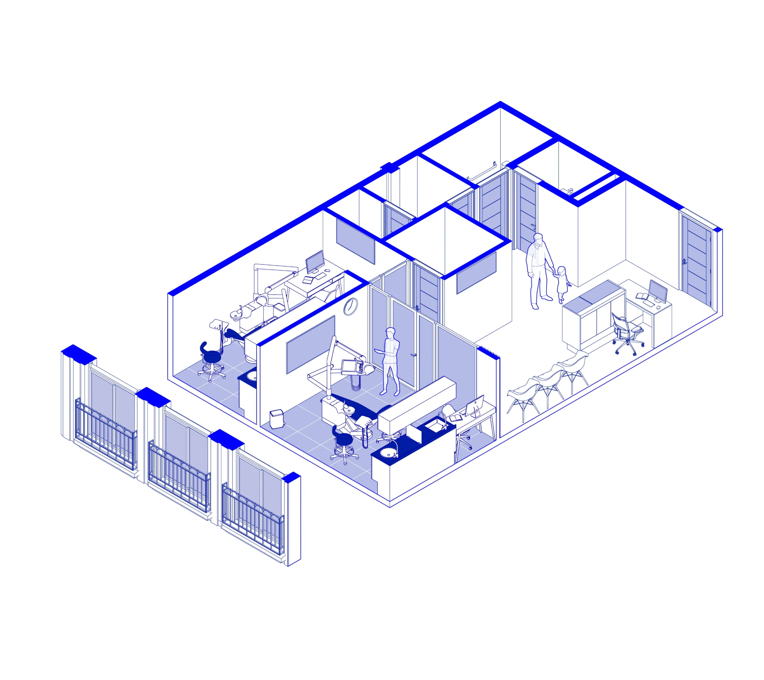 Biosur Dental es una clínica odontológica integral que se enfoca en diversas especialidades, priorizando la rehabilitación oral y el diseño de sonrisas. El proyecto se distingue por el uso de la luz solar como recurso de higiene y herramienta de trabajo. Esta decisión permite que la luz natural atraviese todo el espacio, especialmente en los box dentales, creando un ambiente saludable y acogedor. Los muebles clínicos están diseñados para separar áreas de trabajo sucias y limpias, optimizando la eficiencia y la higiene. Además, cada espacio ha sido concebido desde un enfoque accesible, asegurando comodidad para todos los pacientes.