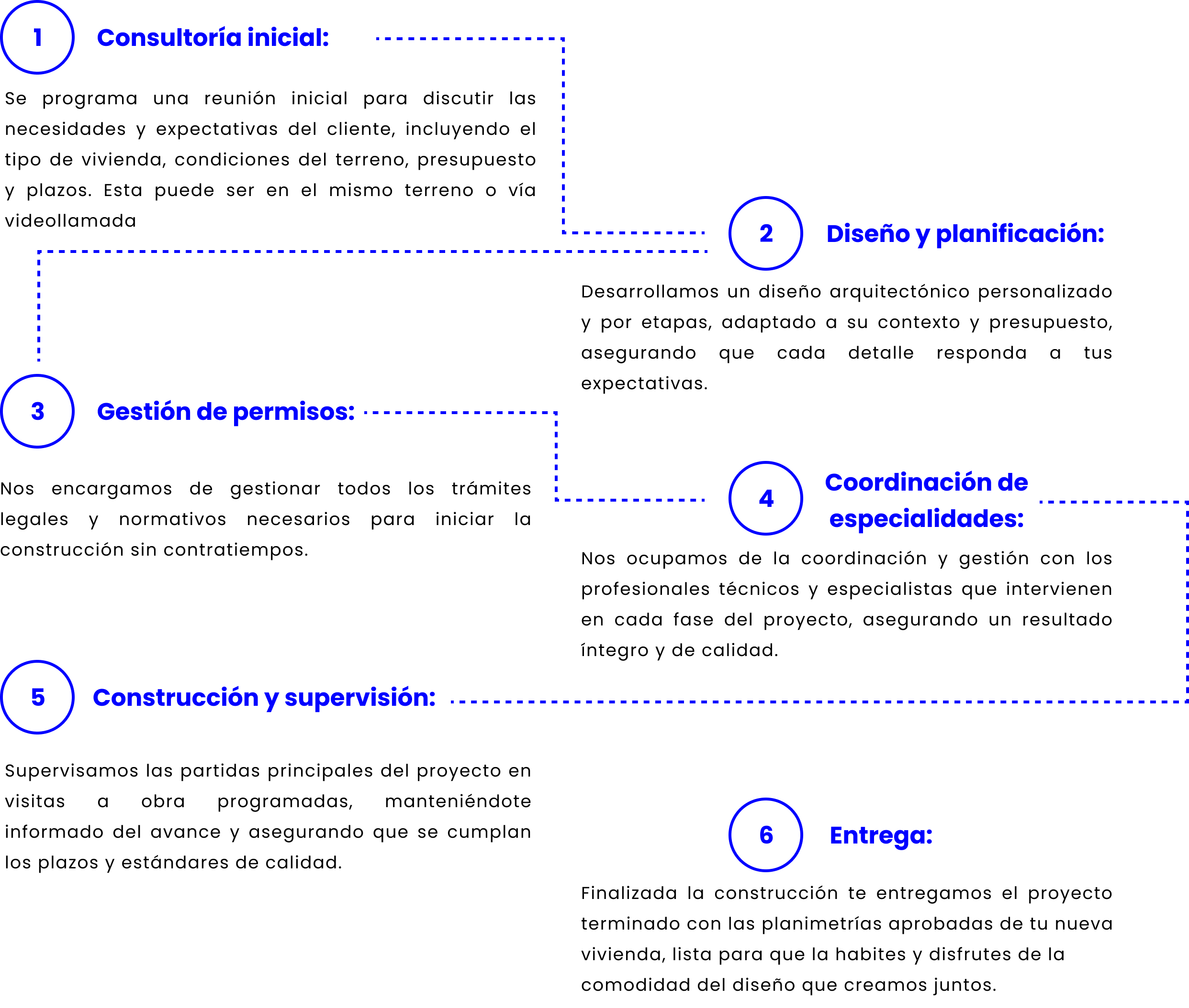 En nuestro servicio te acompañamos en cada etapa del proyecto, desde la idea inicial hasta la entrega de las llaves de tu nuevo hogar.