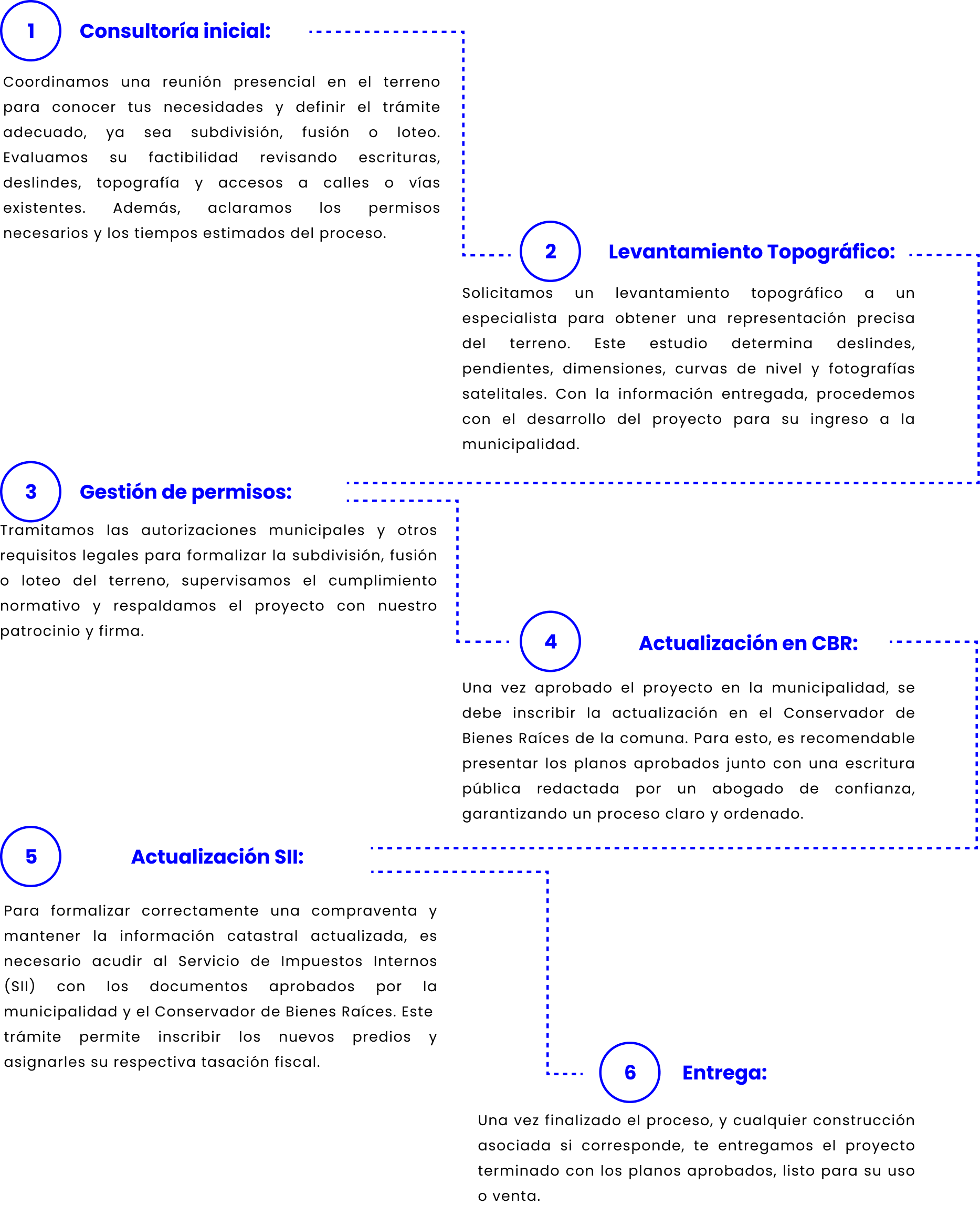 Además de la subdivisión, fusión y diseño de áreas verdes, ofrecemos estudios defactibilidad, regularización de terrenos, asesoría legal en la adquisición de terrenos, y lasupervisión completa de las obras en terreno para asegurar la calidad de los proyectos.